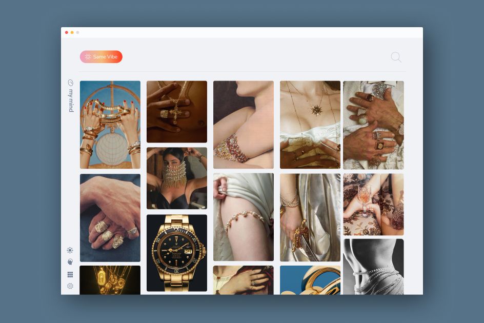 With the Same Vibe feature, mymind can curate images you've saved that match the visual mood, lighting, style or content of your selected image. This helps you explore themes and styles more deeply, often leading to unexpected creative directions.