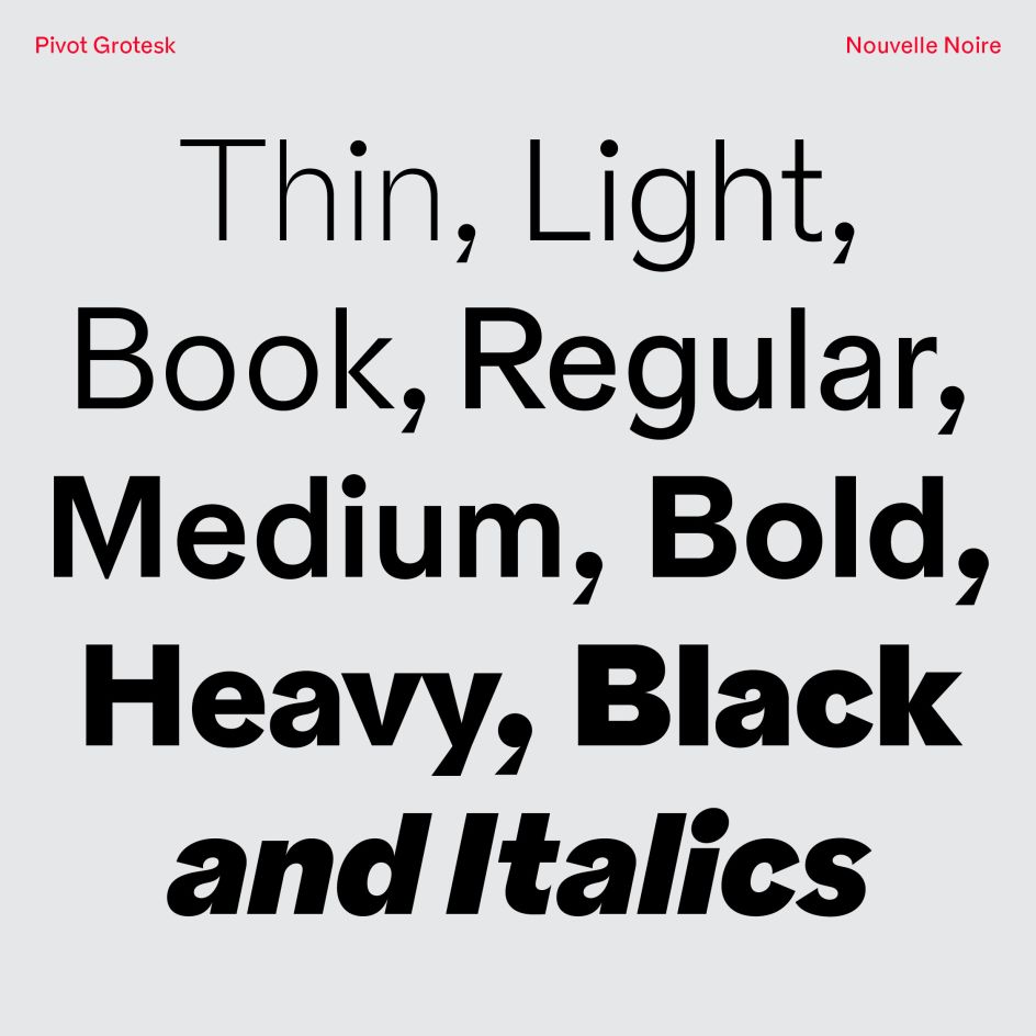 Originally designed for Theater Basel in 2020, Pivot Grotesk has been refined and expanded for its 2024 retail release. The family includes eight weights from Thin to Black, each with matching italics, providing a wide range of expressions.