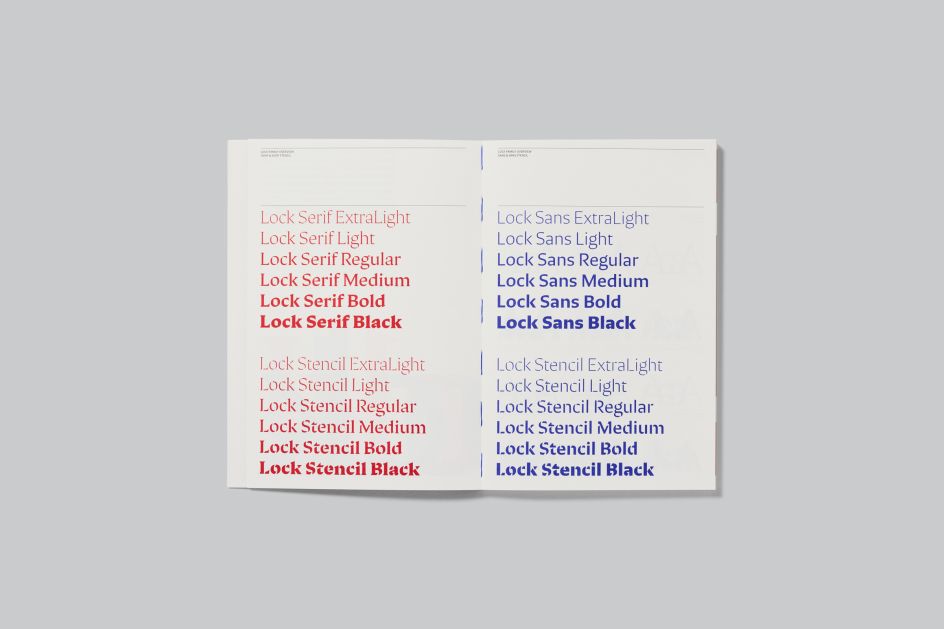 Drawing inspiration from calligraphic strokes, Lock's letter shapes have been carefully crafted to achieve a modern humanist design. The family comprises four subfamilies – Serif, Serif Stencil, Sans, and Sans Stencil – each featuring six weights and glyph alternates and arrows. The Serif version is sharp and outspoken, while the Sans is blunt and understated. Each version offers a playful stencil companion, completing this comprehensive type system.